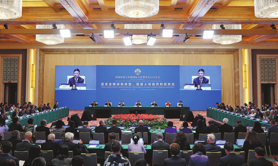 Minister of Ecology and Environment Huang Runqiu addresses the opening session of the 2025 Annual General Meeting of the China Council for International Cooperation on Environment and Development in Beijing on Wednesday. WANG ZHUANGFEI/CHINA DAILY